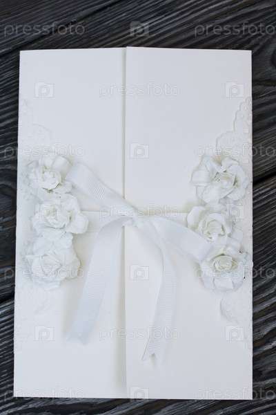 Открытка ручной работы. Украшен бумажными цветами и лентами. Лежит на сосновых досках