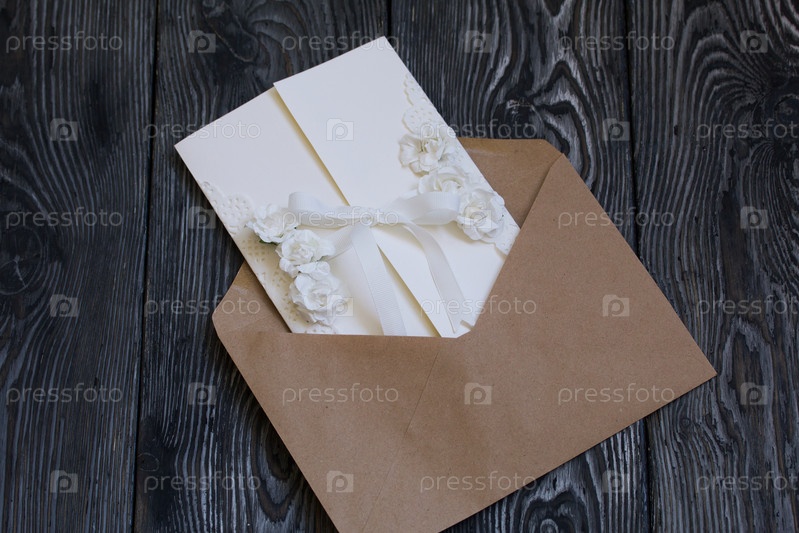 Открытка ручной работы. Украшен бумажными цветами и лентами. Бумажный конверт для упаковки. Лежит на сосновых досках