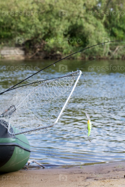 Резиновая надувная лодка на берегу реки. Виден фрагмент лодки с рыболовными снастями