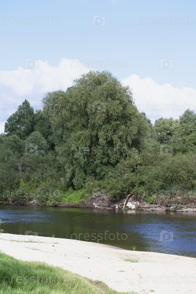 Река течет. Оба берега видны с растительностью. Река Припять на юге Беларуси