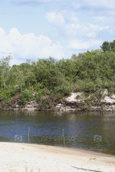 Река течет. Оба берега видны с растительностью. Река Припять на юге Беларуси