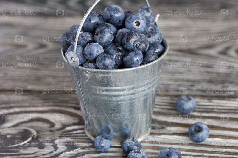 Спелая черника в металлическом ведре. На сосновых досках. Вокруг разбросано несколько ягод. Крупный план