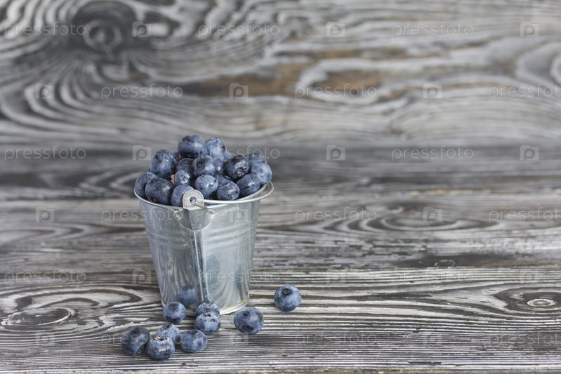 Спелая черника в металлическом ведре. На сосновых досках. Вокруг разбросано несколько ягод. Крупный план
