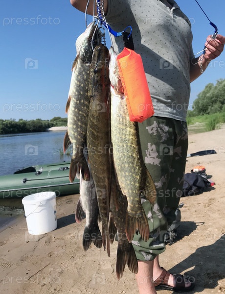 Рыбак держит в руках пойманную щуку. Стоит на берегу реки. На заднем плане видна резиновая лодка