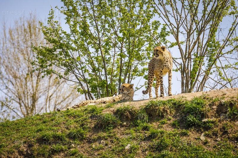 Два леопарда отдыхают на высоком холме