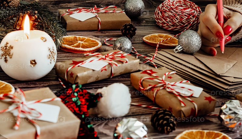Баннер поздравления с новым годом. Женский почерк открытки к празднику на темном деревянном фоне с подарками
