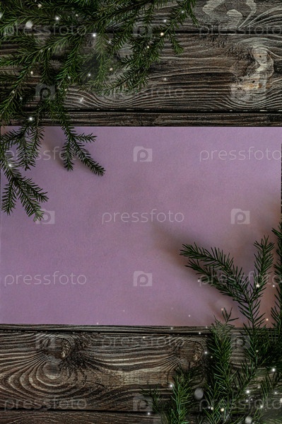 Новогодняя квартира лежала на темном деревянном фоне с местом для цвета текста очени пери, ветки елки со снегом, вертикальное фото