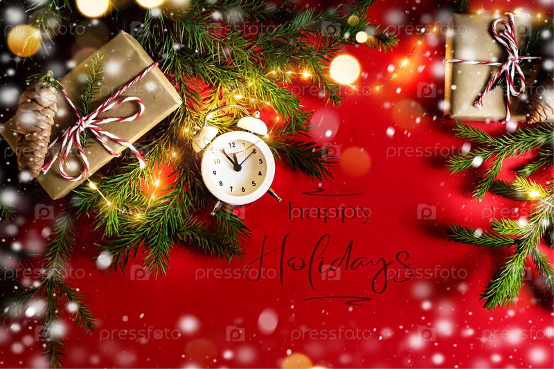 Креативная новогодняя открытка на красном фоне с ремесленными подарками, будильником, ветвями елки и надписью Happy Holidays