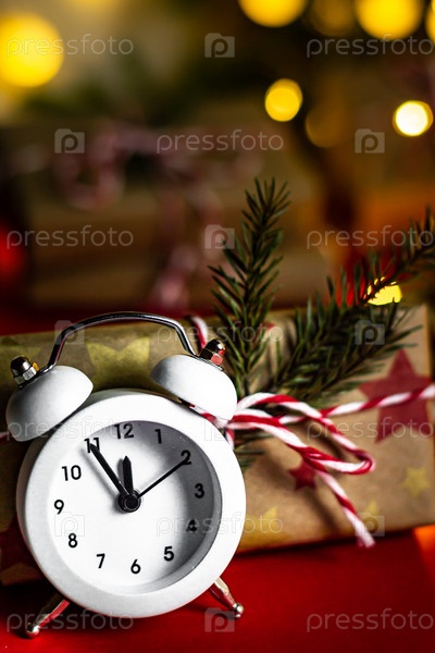 Канун Нового года. Вертикальная поздравительная открытка с праздничным будильником с пяти до полуночи и ремесленными подарками, боке, мягким фокусом, крупным планом