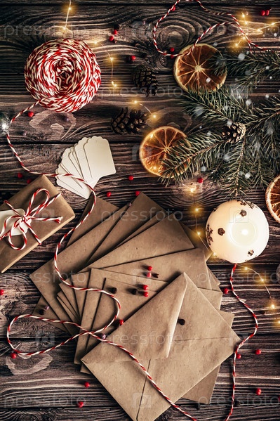 Вертикальная фотография, плоские рождественские украшения, буквы в конвертах, еловые ветки и красные ленты на темном деревянном фоне