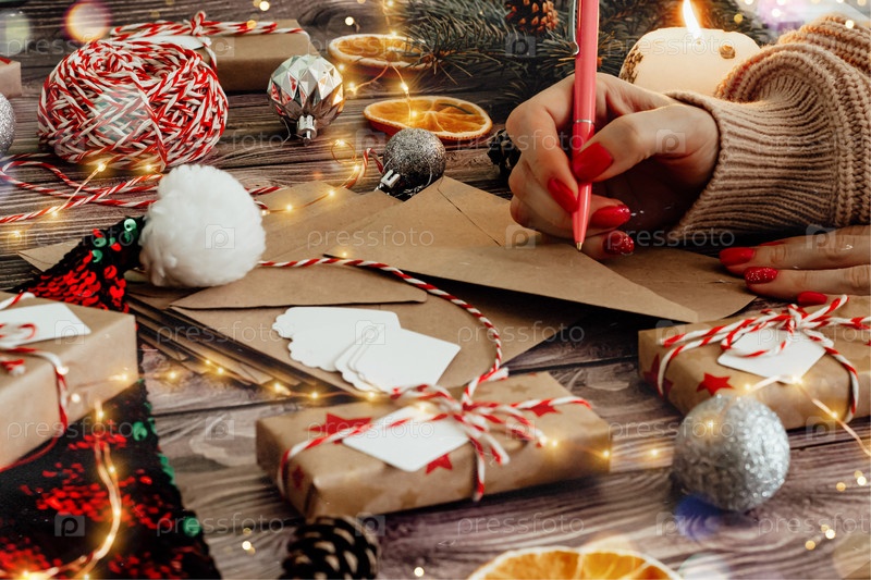 Подготовка к рождественским праздникам женщина пишет вручную список желаний или поздравления с ремесленными конвертами, подарками на темном деревянном фоне