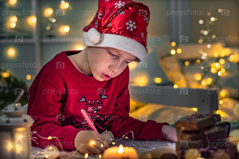 Рождественская традиция, мальчик пишет письмо Санта-Клаусу в красной шляпе