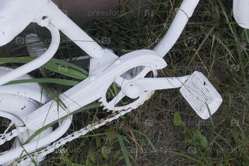 Детский велосипед. Окрашен в белый цвет. Детали интерьера и экстерьера. Крупный план