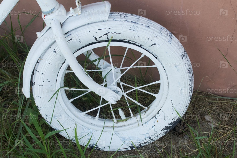 Детский велосипед. Окрашен в белый цвет. Детали интерьера и экстерьера. Крупный план