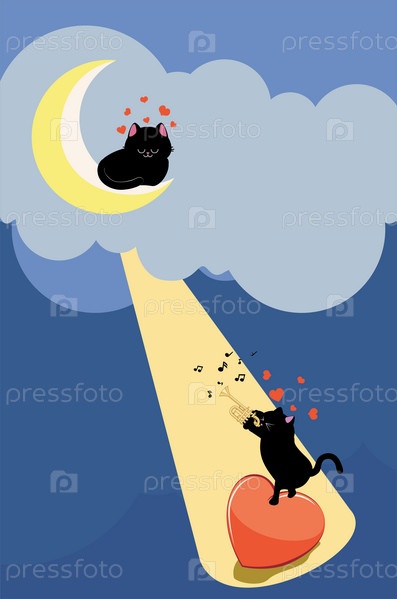 Черный кот играет на трубе для кота на луне