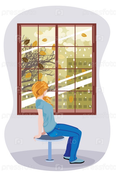Девушка смотрит в окно на осенний город