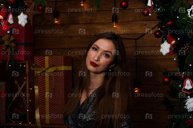 Красивая девушка с длинными волосами в окружении новогодних и рождественских украшений. Празднование Нового года и Рождества