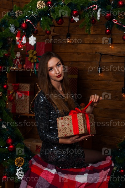 Красивая девушка с длинными волосами в окружении новогодних и рождественских украшений. Празднование Нового года и Рождества