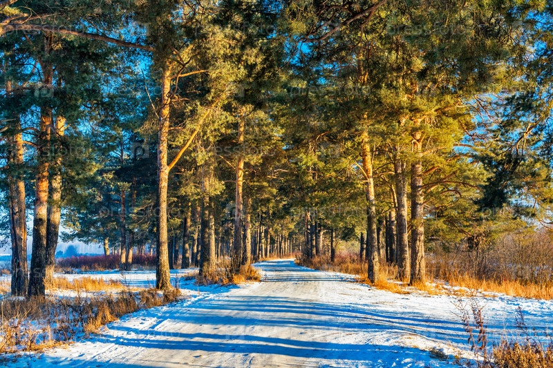 Дорога в сосновом лесу в морозный и солнечный зимний день