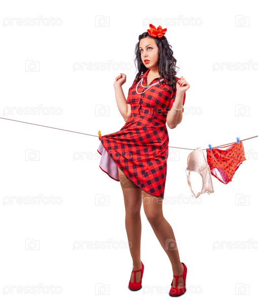 Молодая красивая женщина вешает нижнее белье. студийный снимок. стиль пин-ап