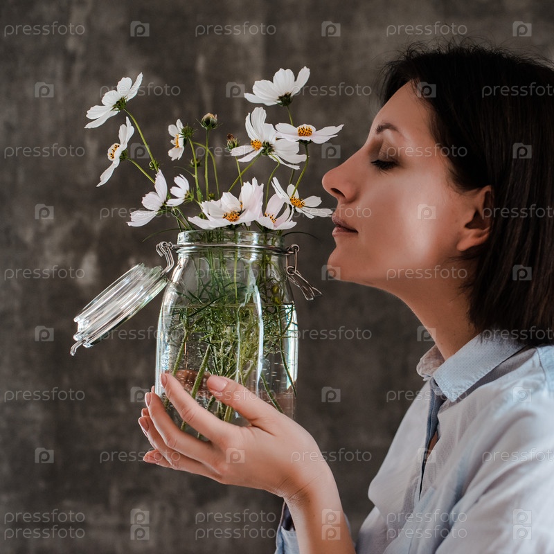 Букет белых цветов в стеклянной банке в руках девушки-флориста на фоне бетонной стены