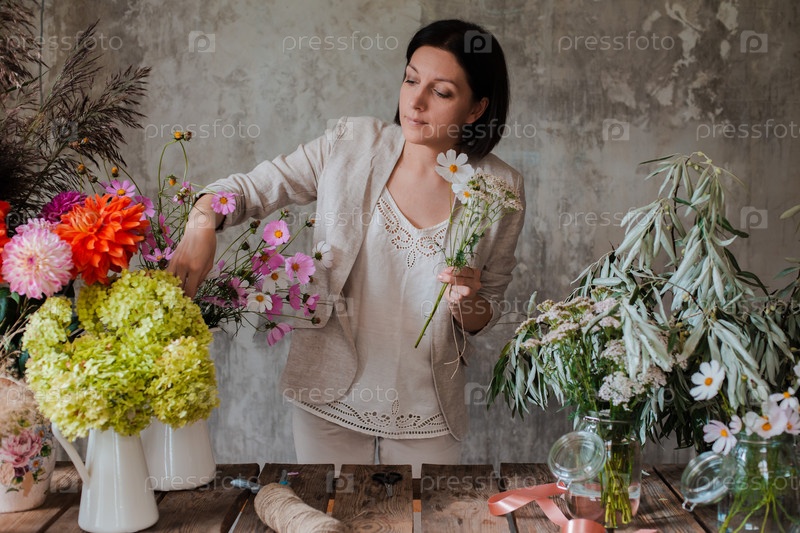 Женский профессиональный флорист готовит композицию из полевых цветов