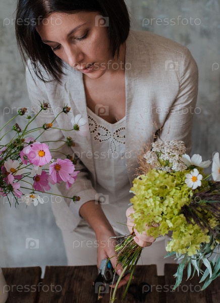Женский профессиональный флорист готовит композицию из полевых цветов