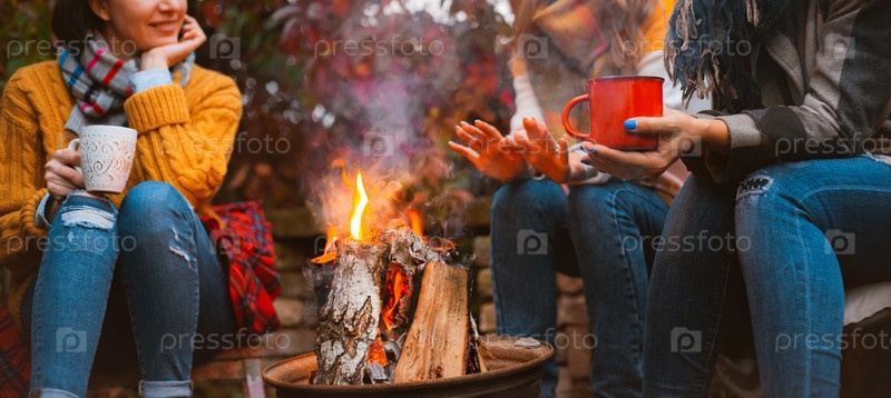 Обрезанное фото трех лучших подруг, сидящих у костра в повседневной одежде, разогревающихся и общающихся, держащих кружки с горячими напитками, счастливых быть вместе на улице холодным осенним вечером