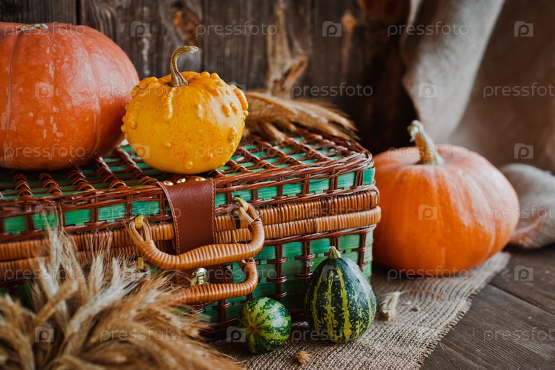 Счастливый фон благодарения, тыквы и плетеная корзина на старом деревянном столе