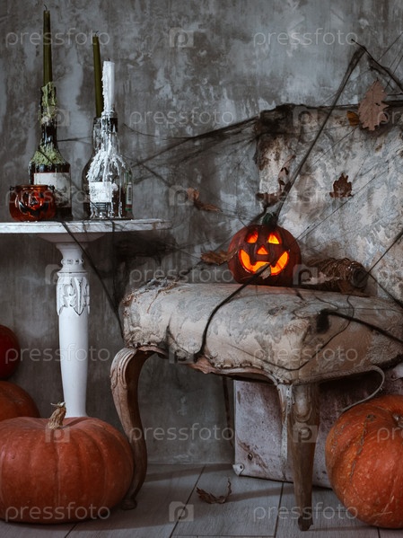 Фон украшений для празднования Хэллоуина. Страшная композиция с тыквой Джека и горящими свечами, паутиной и ведьминой метлой на бетонной стене