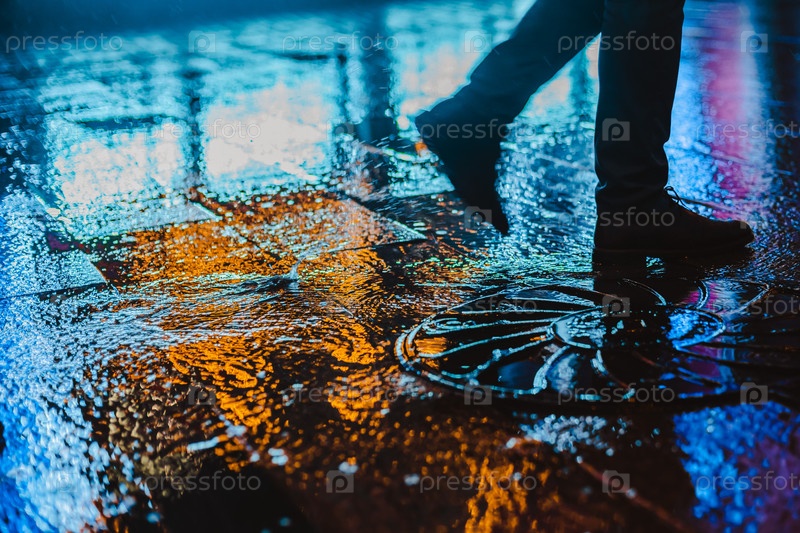 Дождливая ночь в большом городе, отблески огней на мокрой поверхности дороги