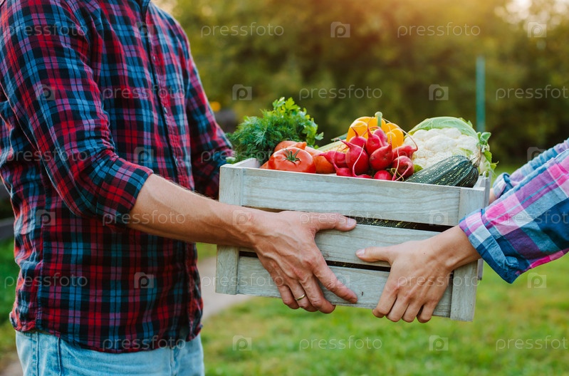 Деревянный ящик с сельскохозяйственными овощами в руках мужчин и женщин, крупный план
