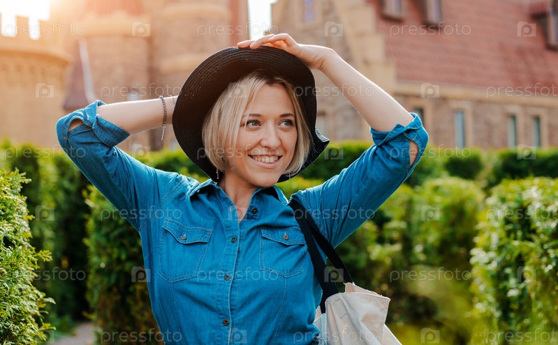 Портрет молодой красивой модной счастливой женщины, позирующей на улице на фоне средневекового Старого города