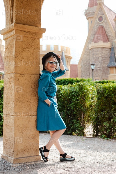Веселая счастливая женщина-странник с модным взглядом во время путешествия за границу летом, женщина-туристка в турне по замку за границей во время отпуска