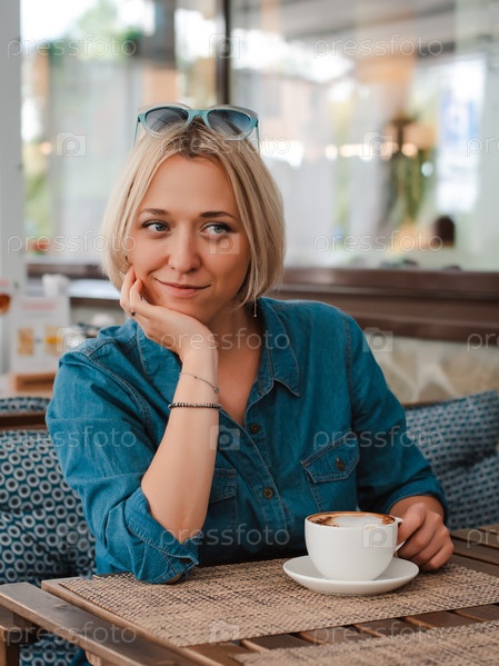 Крупным планом - летний портрет девушки в модных солнечных очках с утренней чашкой кофе, ярко-синего стильного платья