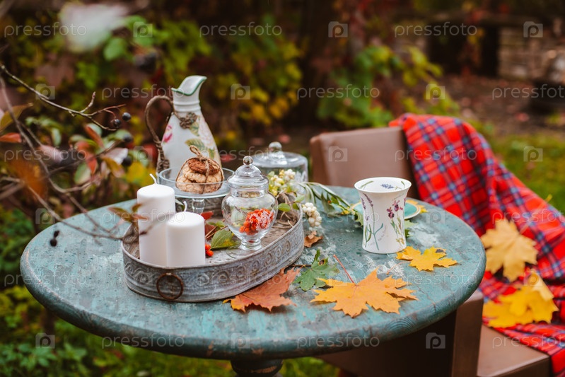 Уютный дворик. Осенние листья лежат на деревянном старинном круглом столе с фаянсовыми чашками, печеньем и свечами