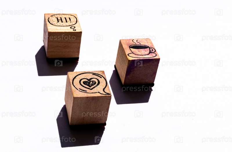 Деревянные кубики с символами кофе и любви на белом фоне