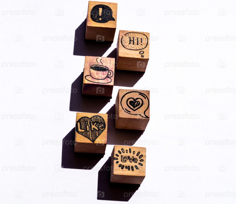 Деревянные кубики с символами кофе и любви на белом фоне