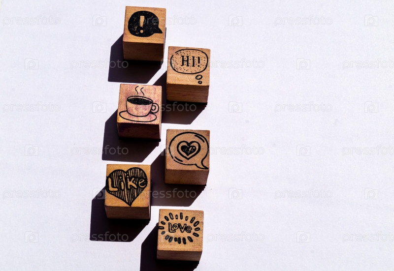 Деревянные кубики с символами кофе и любви на белом фоне