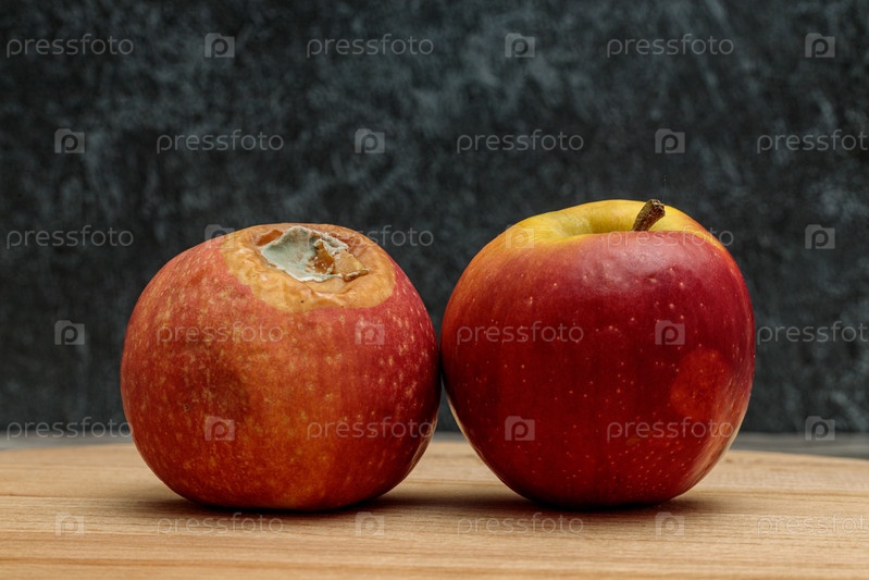 Гнилое яблоко с плесенью и свежее яблоко на темном фоне