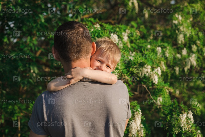 День отца. Отец и сын играют и обнимаются на зеленом фоне листвы и акации. Место для копирования. Счастливая семья
