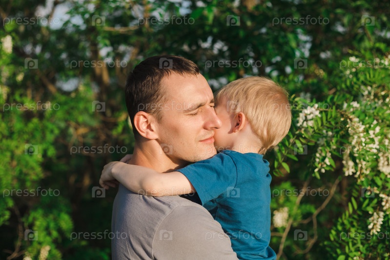 День отца. Отец и сын играют и обнимаются на зеленом фоне листвы и акации. Счастливая семья