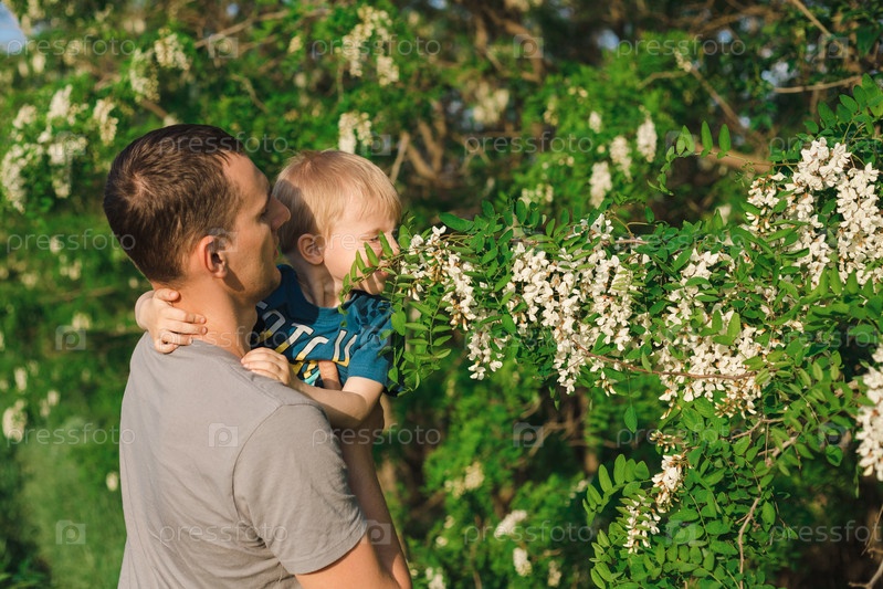 День отца. Отец и сын играют и обнимаются на зеленом фоне листвы и акации. Скопируйте пространства Счастливая семья