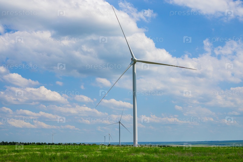 Ветряная электростанция или ветряная электростанция с высокими ветряными турбинами для выработки электроэнергии. Современная новая среда, экономящая инновационные технологии. Копирование пространства