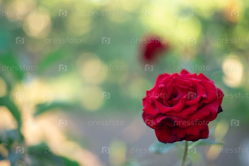 Крупным планом красная роза на зеленом фоне. Открытка, привет. Место для текста