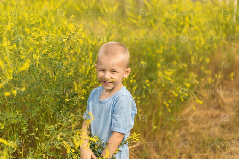Усы мальчика сделаны из желтых цветов в поле. Счастливый ребенок