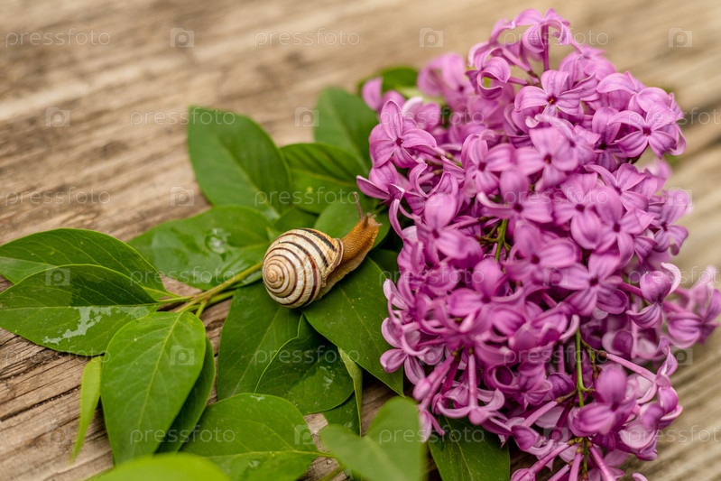 Улитка ползает по зеленым листьям фиолетовой сирени
