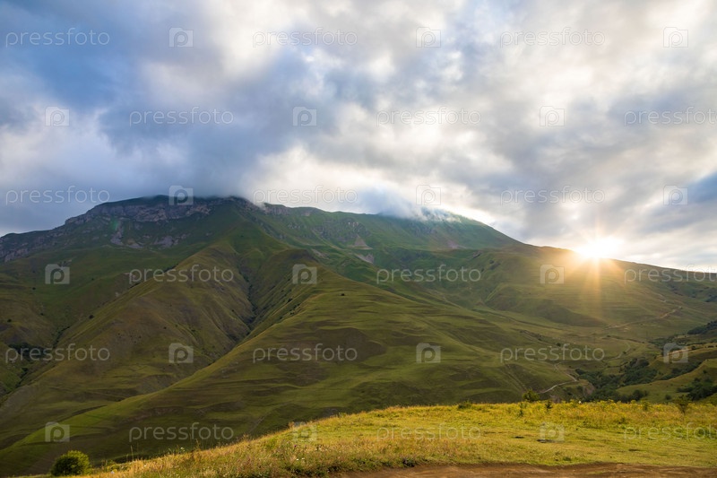 Раннее утро в горах, над вершинами хребта пробиваются первые лучи солнца. Великолепный завораживающий пейзаж
