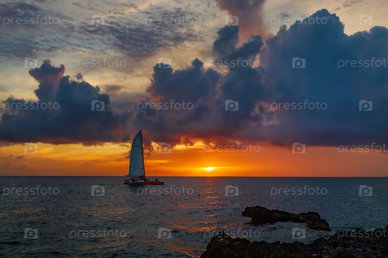 Эффектный ярко-красный закат на море с видимым парусником