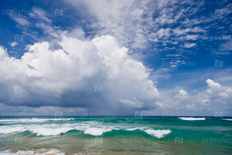 Морской пейзаж, волны с белой пеной сверху на фоне голубой воды